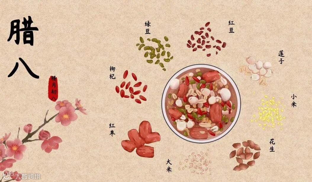 时至今日,腊八节留下不少传统食俗,其中最重要的莫过于喝腊八粥。通常腊八粥是用各种米(糯米、大米、玉米、黄米、高粱米、黑米等)、各类豆(芸豆、赤豆、绿豆、大豆、扁豆等)、不同干果(大枣、板栗、杏仁、花生、核桃、百合、桂圆、莲子等),杂以豆腐、薯芋、肉品、蔬菜等熬煮而成。