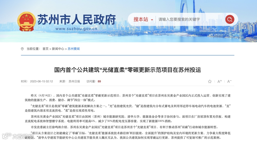 6月14日,国内首个公共建筑“光储直柔”零碳更新示范项目、苏州首个“光储直柔”项目在苏州东吴黄金产业园区内正式投入运营,创新实现了建筑物的能源生产、消费、储存、调节“四位一体”模式。
