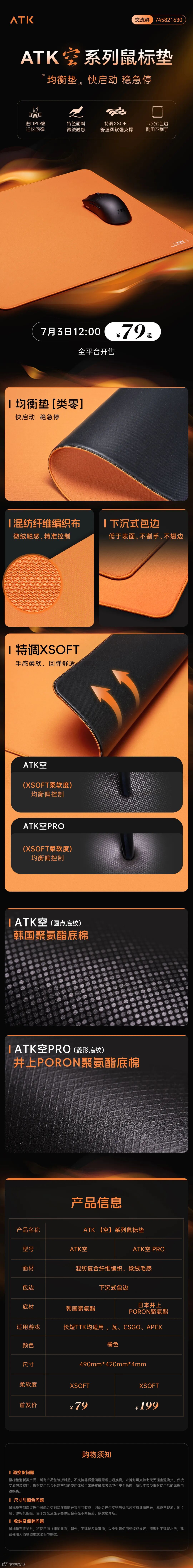 ATK空系列鼠标垫正式发布!起售价仅79元,将于7月3日12:00全平台开售!鼠标垫采用混纺复合纤维编织布面料,拥有微绒触感,具备快速启动和急停稳定的特性,适用于各类FPS游戏。下沉式包边,不割手。ATK空采用4mm厚度韩国进口聚氨酯底棉,空PRO采用4mm井上Poron底棉,圆点/菱形底纹,提供超强吸附力,稳定防滑带来卓越的鼠标操控体验。490*420*4mm 的黄金尺寸,不论你是手臂流还是手腕流都非常合适!7月3日不见不散~