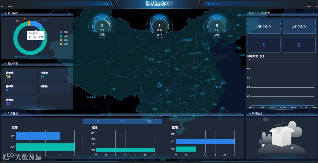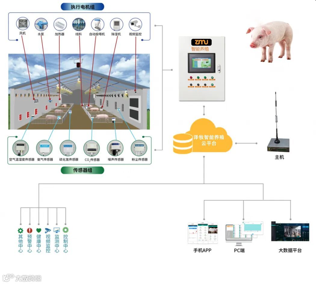 智慧养殖系统是一套联动控制、监测养殖场生产的系统,由传感器等感知硬件、无线采集终端、控制柜和云平台组成,将养殖场中的通风系统、饲喂设备、供水设备、蓄水池、水电能耗等部分串联起来,多维度、智能调控养殖场的各类设备,同时实时监控各类突发情况并预警提示。