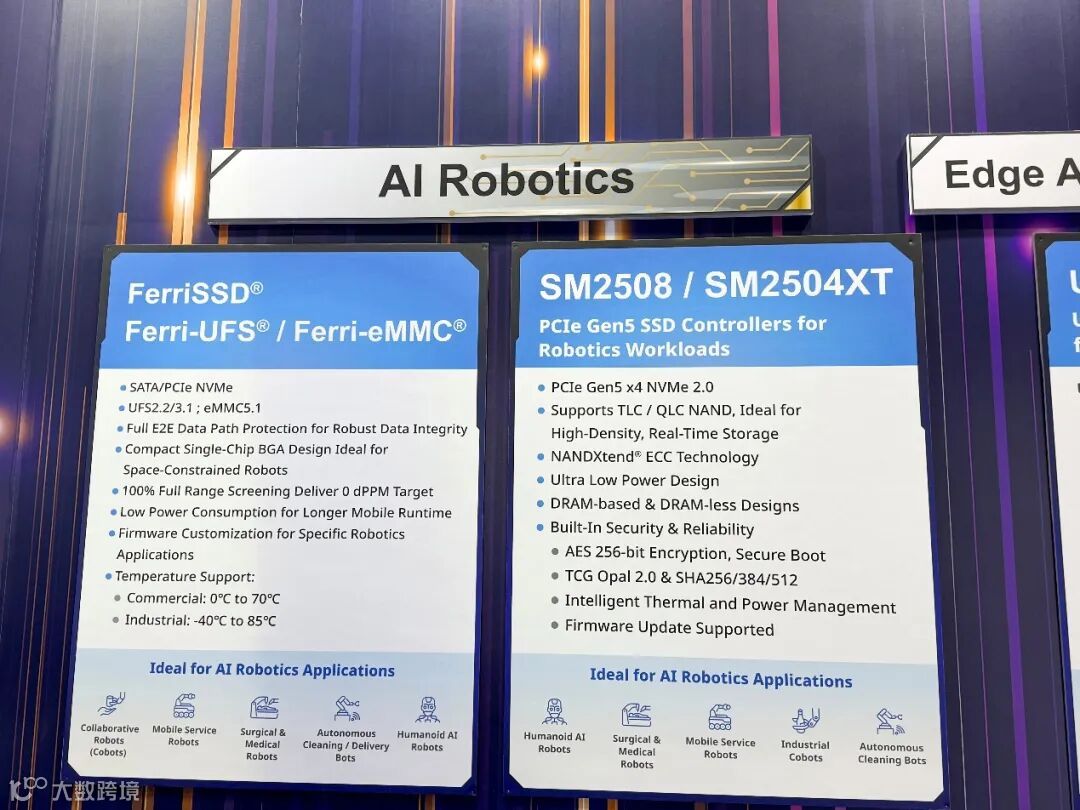 随着AI技术向终端渗透,AI机器人(AI Robotics)正成为极具潜力的新兴市场。机器人需要在复杂的环境中进行实时感知、决策与执行,这对存储系统的速度、响应能力和可靠性提出了严苛要求。