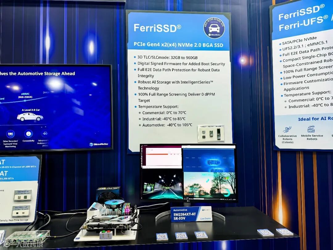 在汽车AI领域,汽车的智能化对数据存储的带宽、可靠性与耐久性提出了车规级的严苛标准。慧荣科技通过现场动态演示其SM2264XT-AT PCIe Gen4主控,生动展现了为智能座舱、车载信息娱乐(IVI)和高级辅助驾驶(ADAS)系统提供高带宽、低延迟数据处理的能力。同时,展台还展出了包括FerriSSD、Ferri-eMMC在内的完整Ferri系列嵌入式存储解决方案,它们凭借出色的稳定性和耐宽温特性,为汽车ECU、事件记录仪等关键应用提供了坚如磐石的存储保障。