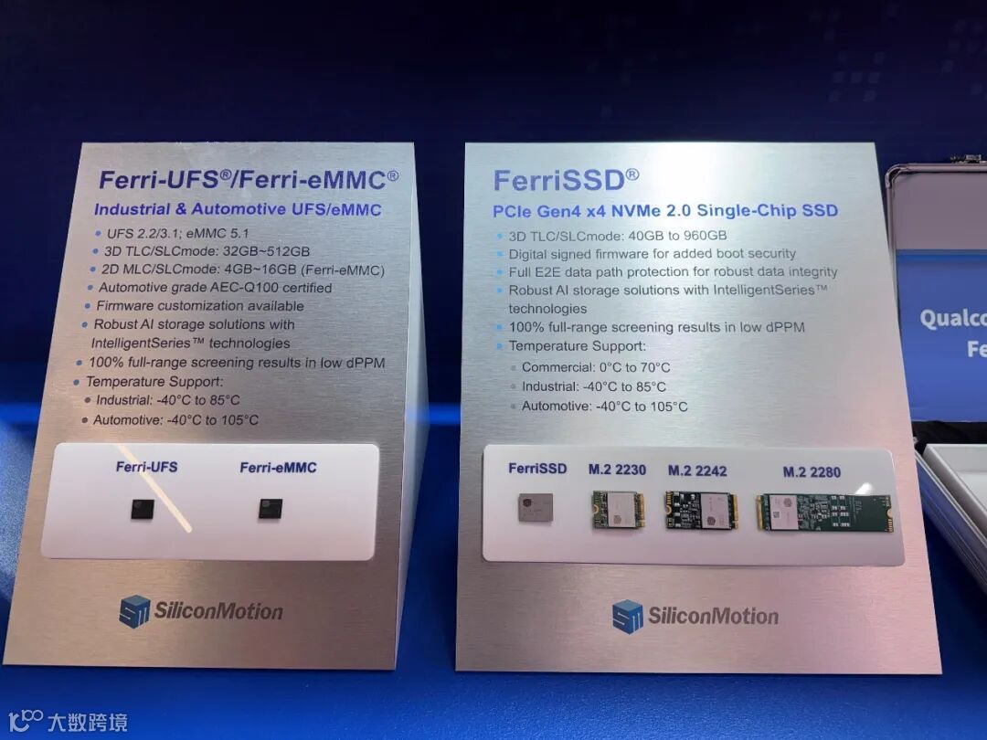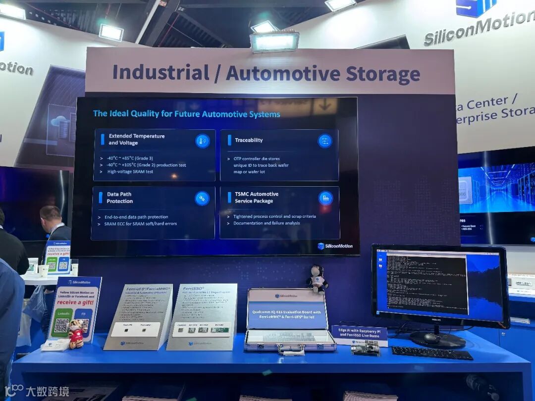 面向现代汽车的ADAS(高级驾驶辅助系统)和集中式计算架构,慧荣科技展出了达到严苛车规级标准的产品线。相关车用SSD主控芯片不仅严格符合AEC-Q100、IATF16949以及ISO26262 ASIL B等国际认证,更荣获了ASPICE CL3软件开发成熟度认证,构建了极高的技术壁垒,确保在极端工况下提供高可靠性与数据安全。