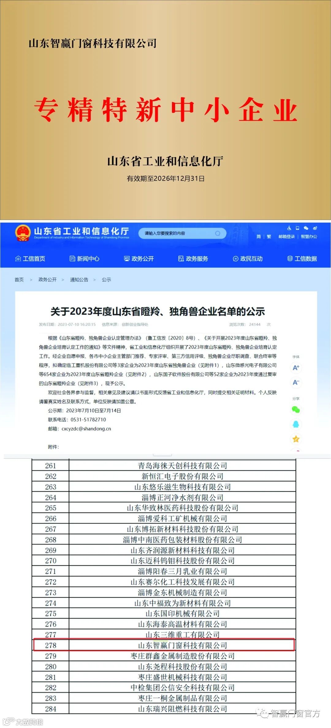 近日,山东省工业和信息化厅公示了2023年度山东省“瞪羚、独角兽”企业通过名单,山东智赢门窗科技有限公司在荣获2023年度山东省“专精特新”企业基础上,此次成功入选2023年度山东省“瞪羚企业”。