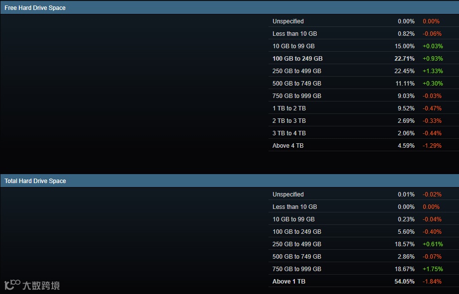 根据Steam平台官方公布的2024年8月玩家硬件数据,总硬盘空间这一项中,硬盘空间大于1TB的玩家占比为54.05%,需要注意的,硬盘空间低于500GB的玩家占比依然还有24.4%。空余硬盘空间项目中,只有39%的玩家拥有超过500GB的空余硬盘空间,大部分玩家的硬盘空间处于100GB至499GB之间,而这个空间只能安装下3个大型游戏。