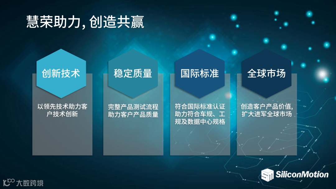 国际标准:慧荣科技产品符合所有国际标准,包括车规、工规、云存储、数据中心等所有规范标准,客户可安心、便捷地使用慧荣科技的主控芯片打造自有的存储产品。