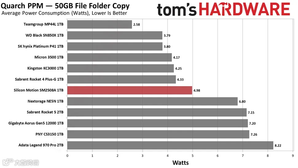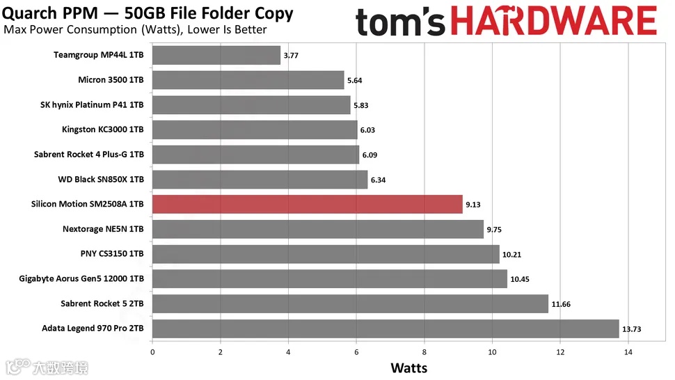 功耗是SM2508尤为突出的特点,Tom's Hardware使用 Quarch HD 可编程电源模块来深入了解SSD的功耗情况,分别进行了闲置功率、每瓦传输速度、最大功耗等多项测试。
