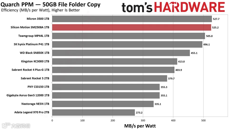每瓦传输速度中,SM2508达到了525.2MB/s,位居榜单中第二名。