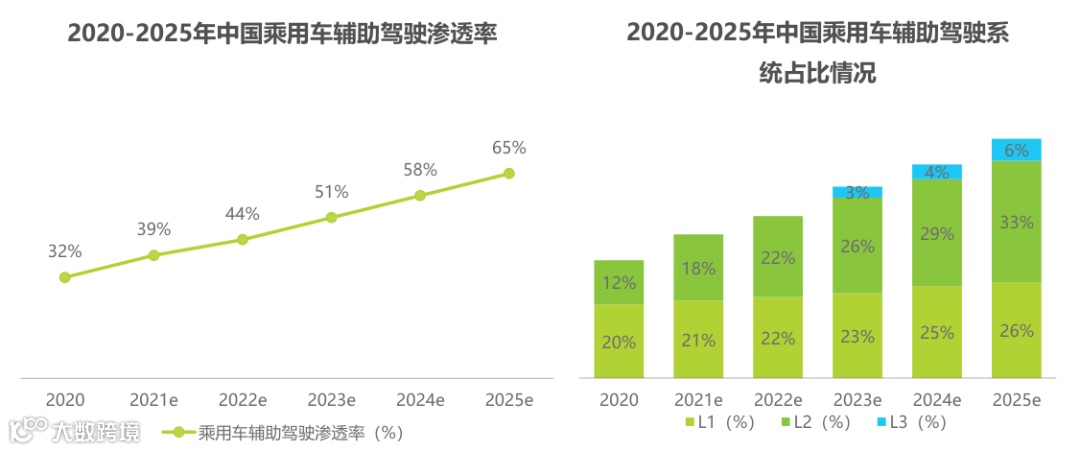 根据艾瑞咨询《2021年中国智能驾驶行业研究报告》相关数据表示,2020年乘用车辅助驾驶渗透率约32%左右,随着汽车电子、软件、算法等技术的发展,预计2025年渗透率或达到65%。并且在2023年,将会有L3等级的辅助驾驶系统出现。