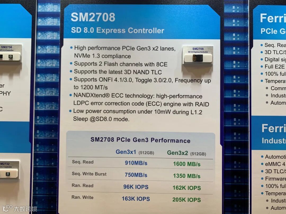 SM2708 SD Express 主控芯片解决方案采用PCIe Gen3 x2(x1)接口及NVMe 1.3规范,并支持最新一代3D NAND,搭载慧荣科技独有的NANDXtend ECC技术、数据路径保护和可编程固件,可大幅提高3D NAND的可靠性和耐用性。