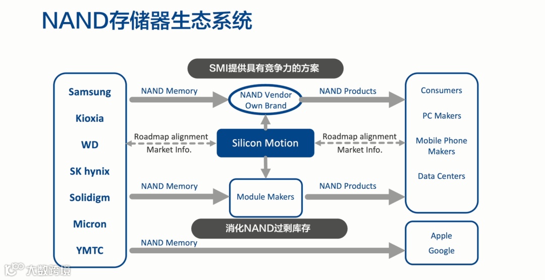 黄士德先生提到,在庞大的NAND存储器生态系统中,包含着三星、铠侠、长江存储等闪存原厂,消费级SSD、PC制造商、智能手机制造商、数据中心以及Apple、Google等终端应用厂商。