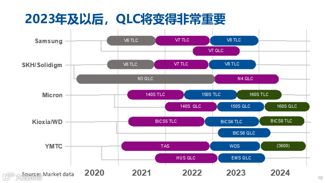 同时,存储介质也会随着大容量的需求而改变。目前市场上已经推出了不少QLC SSD产品,市占率已达到15%。随着主控芯片在闪存管理方面技术的进一步完善,QLC的寿命以及性能将会逐渐改善,预计从2023年开始,QLC将会在消费级市场中大量应用,并且在ZNS的加持下,QLC在企业级SSD市占率上也会有所提升。