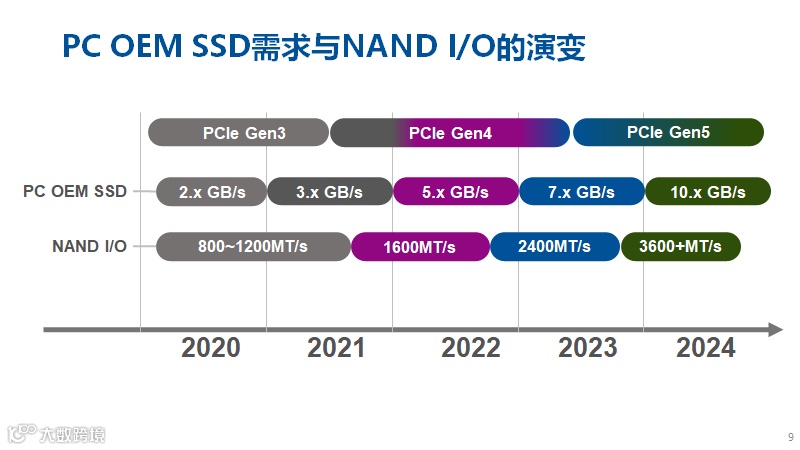 自AMD在桌面端X570芯片组上支持PCIe 4.0开始,到Intel与AMD全面迎接PCIe 4.0时代,Gen4 SSD从崭露头角逐渐成为了2022高端PC的标配。不难看出,SSD的更新迭代与PCIe接口与NAND I/O演变息息相关。到2023年,支持PCIe Gen5的设备将会陆续上市,SSD的传输速度进一步突破,慧荣科技也将推出PCIe Gen5主控芯片产品,最大传输速度可达到3,600 MT/s以上,为次世代高性能应用提供强劲性能支持。