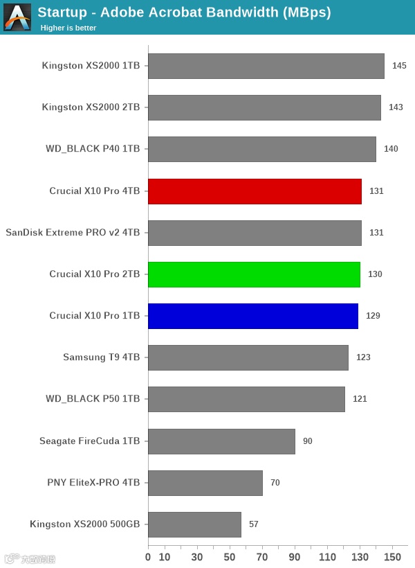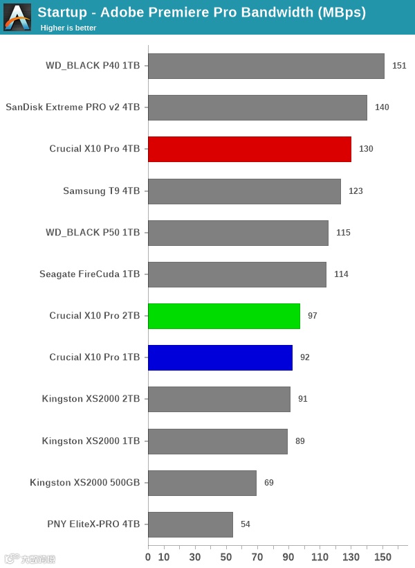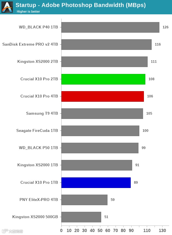 在Adobe常用创意工作软件中,英睿达X10 Pro均提供了位于榜单前列的性能表现,在4TB大容量的加持下,更能为创意工作者们提供性能与容量的均衡体验。