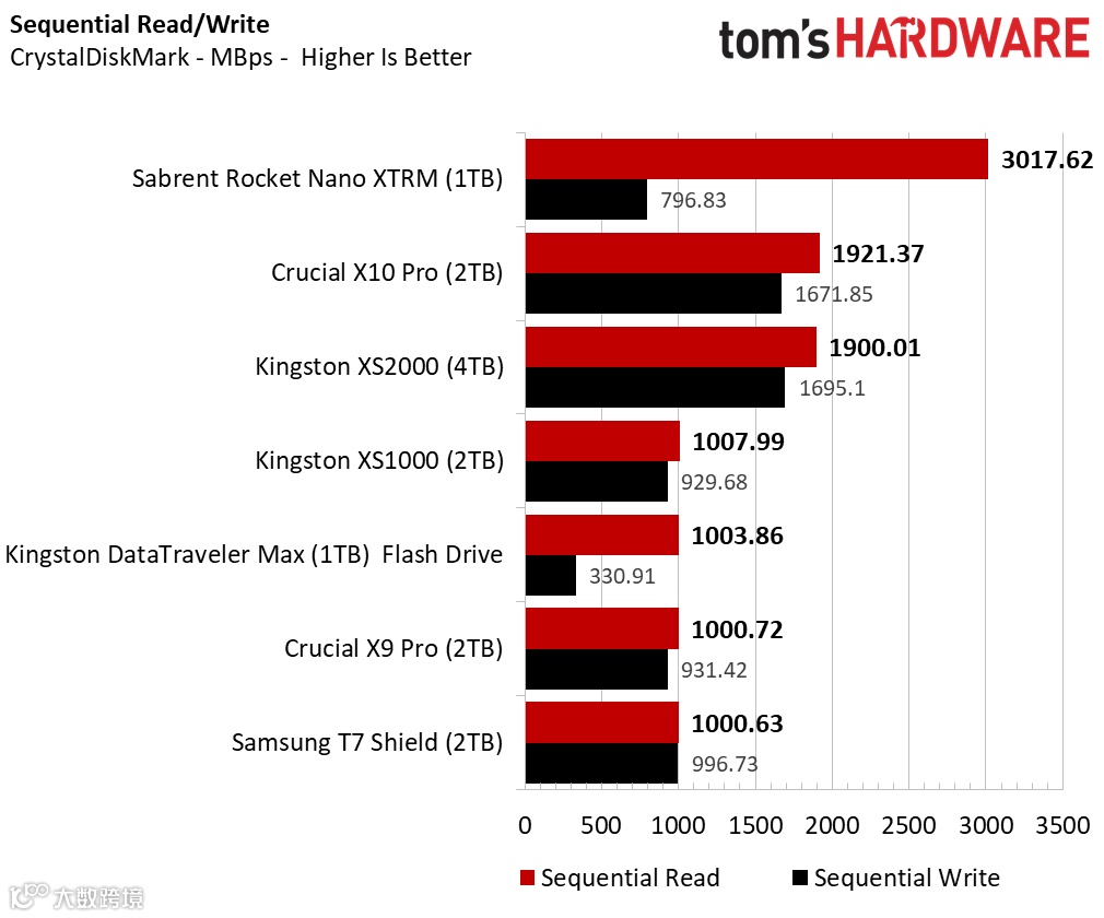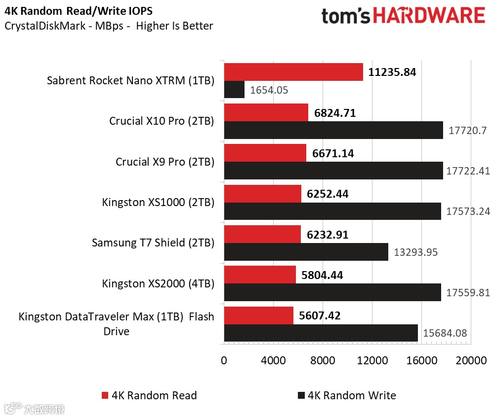 媒体Tom's Hardware的测试榜单中,英睿达X10 Pro的连续读写和4K读写的性能位居USB接口存储产品中的前列。(Sabrent Rocket采用雷电接口)
