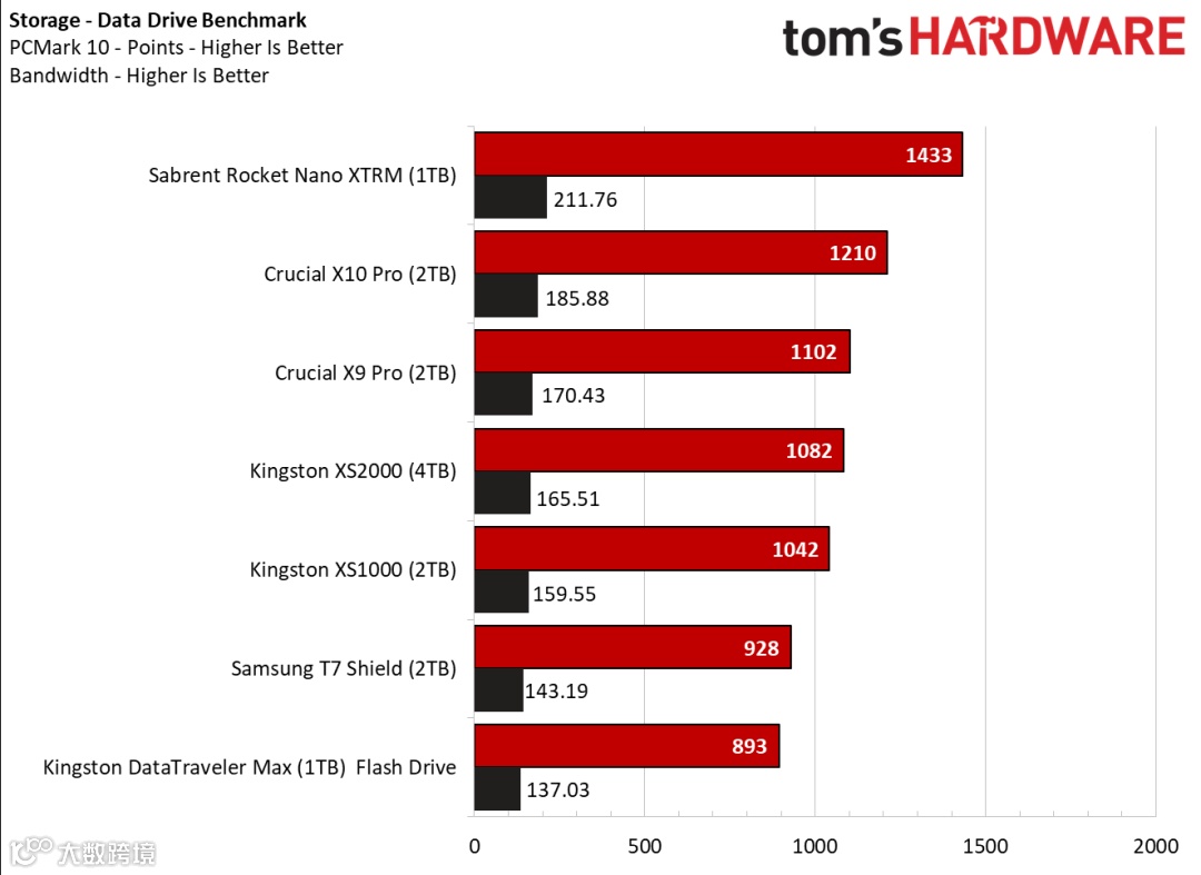 媒体Tom's Hardware的PCMark10存储测试中,英睿达X10 Pro和X9 Pro分别位居榜单的二三名,处于USB接口存储产品的领先位置。(Sabrent Rocket采用雷电接口)