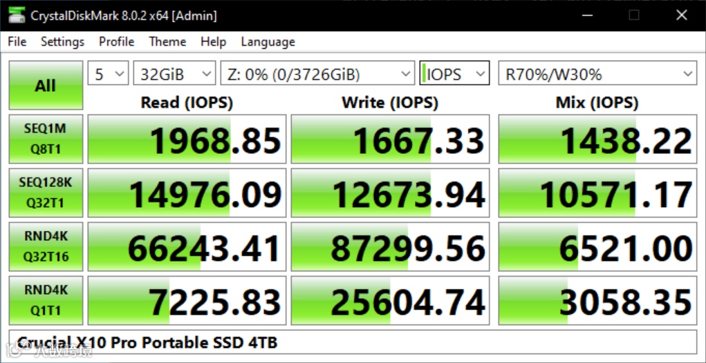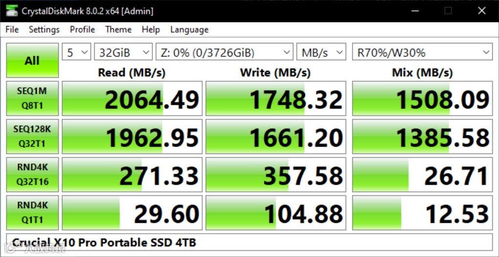 CrystalDiskMark的32GB文件测试中,4TB容量的英睿达 X10 Pro能够达到2064MB/s的连续读取速度和1748MB/s的连续写入速度。随机性能方面,当队列深度从1提升到21时,明显可以看到IOPS性能增加,证明了其NCQ(本地命令队列)处于激活状态,并且运行良好。