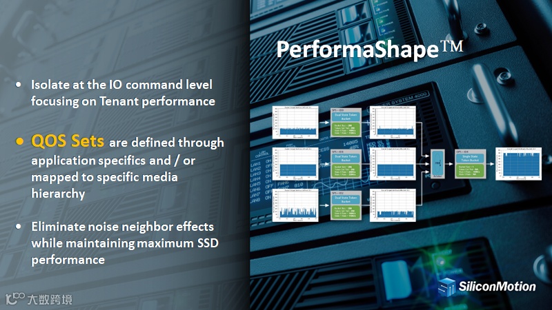 以上两种方案都是目前企业级SSD市场中常见的操作,但都有其劣势。为此,慧荣科技在MonTitan™ PCIe Gen5 SSD解决方案平台所采用的SM8366主控芯片上研发了全新的PerformaShape技术,采用双状态令牌桶算法(Dual State Token Bucket Algorithm)所实现的硬件隔离以确保最大的带宽性能,大幅提升使用者定义的特定性能指标(包括:QoS、延迟、随机读取/随机写入和功耗等)。