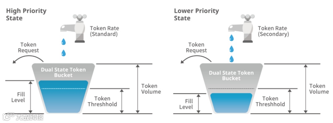 在左图中,当令牌桶中的令牌数量大于预设的阈值时,令牌填充速率就会降低,但是当收到请求处理指令时,就会以较高优先级进行处理。而在右图场景中,令牌数量少于预设阈值时,令牌填充速度会加快,此时收到的请求处理指令则会以较低优先级进行处理。由于整个机制一直处于动态调整中,因此就会使得系统达到尽可能均衡的状态。