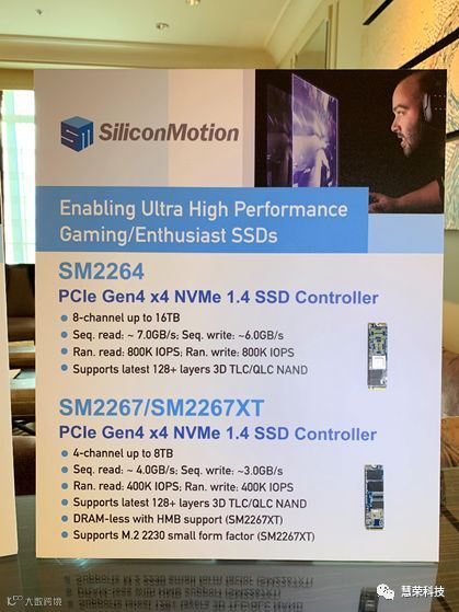 服务器端、个人PC及笔记本平台中锐龙处理器所占市场份额随着第三代锐龙处理器的发布不断攀升,作为第三代锐龙处理器特性之一的PCIe 4.0所使用场景也逐渐增多。慧荣科技展出了SM2264及SM2267两款PCIe Gen4 x4主控芯片,均支持最新的NVMe 1.4协议和128层3D TLC/QLC闪存。其中SM2264定位于高端发烧平台,内建8条通道,最大容量可达16TB,最高连续读写速度可达7,000/6,000 MB/s,最高随机读写速度可达800K/800K IOPS。SM2267主控芯片定位于主流平台,内建4条通道,最大容量可达8TB,最高连续读写速度可达4,000/3,000MB/s,最高随机读写速度可达400K/400K IOPS。