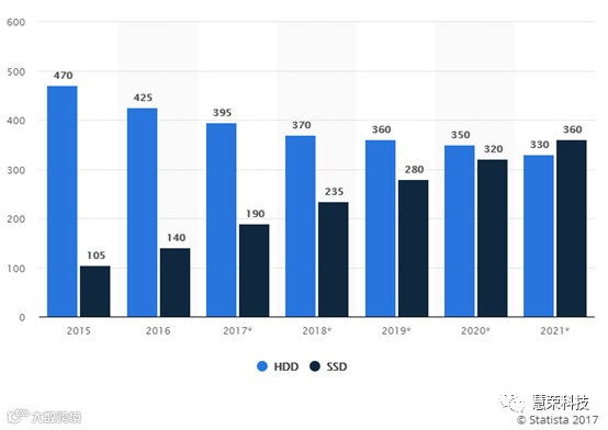 市场上硬盘种类大体可以分为两类:机械硬盘(HDD)和固态硬盘(SSD),目前机械硬盘在市场份额上占有绝对优势,但是根据市场调查机构Statista公布的预测,在2021年固态硬盘的销量将会超过机械硬盘,2017年机械硬盘的出货量预计不足4亿块,而在2021年这个数字会缩减至3.3亿块,而固态硬盘的出货量会从今年的2亿块提升至3.6亿块。