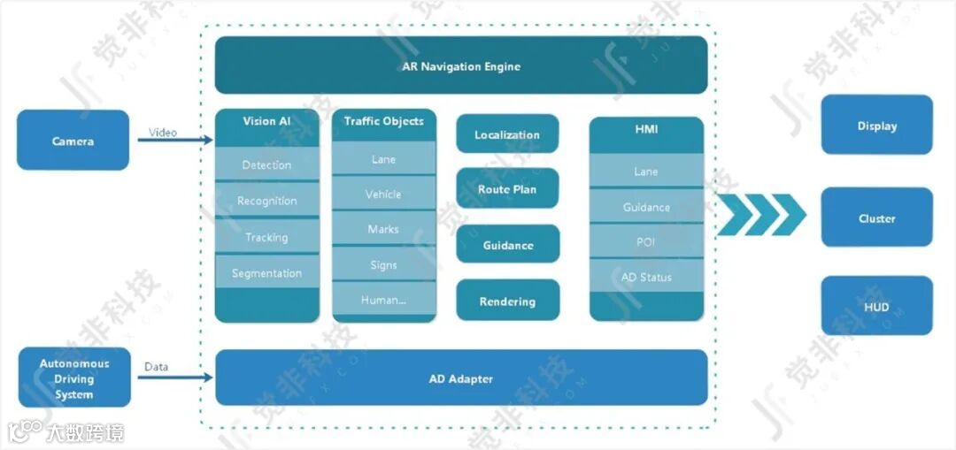 首先,增强AR导航引擎的系统的输入包括摄像头采集的视频流,同时AD Adapter模块可以接收自动驾驶控制和决策域输出的相关信息,并在AR场景中进行可视化输出,同时可完美适配于中控大屏、仪表盘、HUD等人机交互设备。