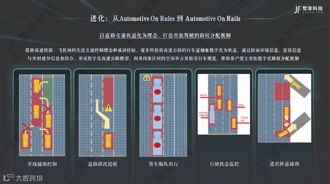 2020年,觉非科技借助高速铁路、飞机场的先进交通控制理念和成功经验,将高速公路的行车道抽象数字化为轨道,通过路面环境信息、定位信息和实时感知信息相组合,形成了数字化高速公路模型,并利用闭塞区间的空闲和占用指导行车规范,建立了智能数字化路权分配机制,即Automotive On Rails。其功能包括并线辅助控制、道路路况提醒、货车编队出行、行驶状态监控、进出匝道辅助等。