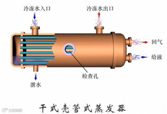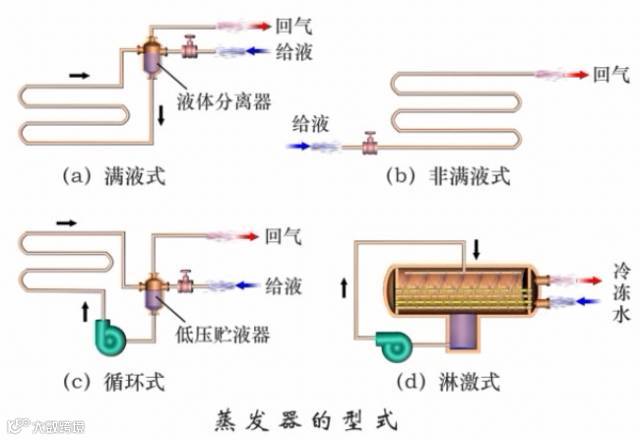 干式(非满液式)蒸发器、再循环式蒸发器、满液式蒸发器、喷淋式蒸发器。