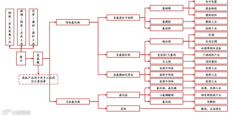 氟化工产业的起点是萤石,萤石也称为氟石,主要成分是氟化钙(CaF2)。有机氟化物和无机氟化物均主要由萤石与硫酸反应生成的无水氢氟酸制得,换句话说,萤石是氟化工产品的主要前端原材料。