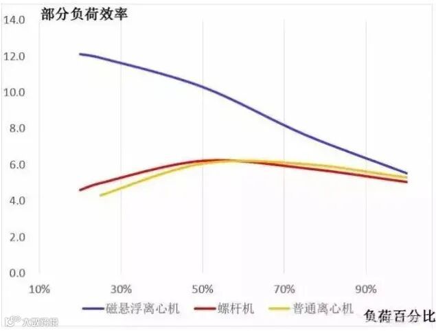 磁悬浮冷机无油系统,制冷剂中不会混入润滑油,提高了冷凝器和蒸发器的换热效率;磁悬浮轴承与传统的轴承相比,磁悬浮轴承的摩擦损失仅为前者的2%左右,从而提高了机械效率;磁悬浮冷机采用数字变频控制技术提高了冷机部分负荷效率。