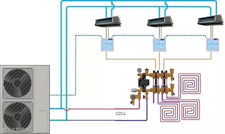 水机中央空调一个显著的优点是可以搭配水地暖,实现冬暖夏凉。但制冷和采暖两种系统如何连接,它们的管道有区别吗?