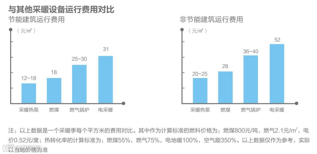 从以上数据可以看出,100平米的节能建筑,空气能热泵采暖运行费用为12-18元/平米,也就是说整个采暖季运行费用大约为1200-1800元;非节能建筑,空气能热泵采暖运行费用为20-25元/平米,整个采暖季运行费用大约为2000-2500元。