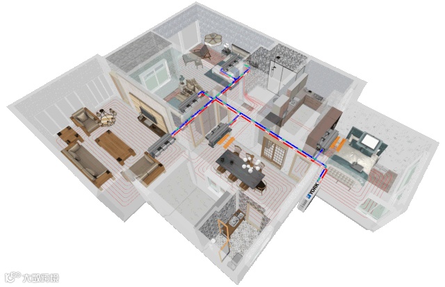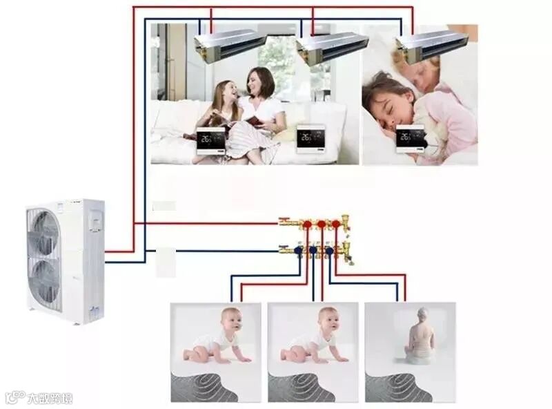 空气源热泵冷暖机组的技术成熟,是该系统得以实现的关键因素!两联供系统一开始被暖通业称为“一源两末端”,“一源”是指冷热源使用空气源热泵冷暖机组,“两末端”指辐射盘管和风机盘管并存的末端系统。全部室内以水为换热媒介(氟机则是以冷媒来换热),夏季供冷水,直接采用低温水送到风机盘管进行制冷。冬季供热水,从室外机直接提供45℃左右热水供地板采暖。该系统配合缓冲水箱二次系统的稳定性和地暖良好的热稳定性,系统整体稳定性较高。