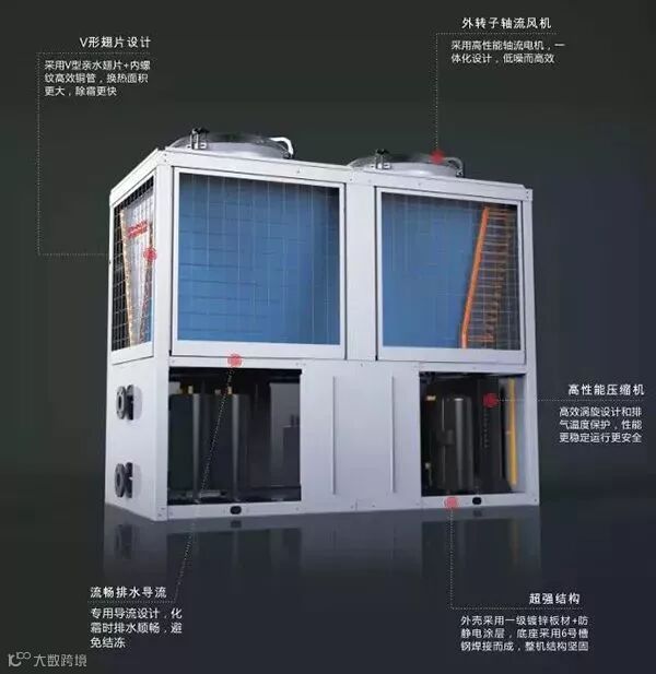4、安装方便:空气源热泵占地空间很小,外形与空调室外机相似,可直接接保温水箱或与供暖管网连接,适合于大中城市的高层建筑,对于大型中央供热问题,热泵是最好的选择。