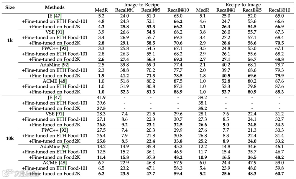 我们还在跨模态菜谱-食品图像检索任务上进一步验证Food2K的泛化能力。具体来说,我们在Recipe1M[11]数据集上验证方法的性能,并使用与之相同的数据集划分方法。与此同时,我们使用MedR和Recall@K指标来评估。表6展示了我们使用不同的网络主干,并分别通过ImageNet、ETH Food-101和Food2K数据集预训练的结果。结果发现使用ETH Food-101和Food2K数据集预训练后在目标数据集上微调都取得了性能的增益,使用我们的Food-2K数据集取得了更大的性能增益。