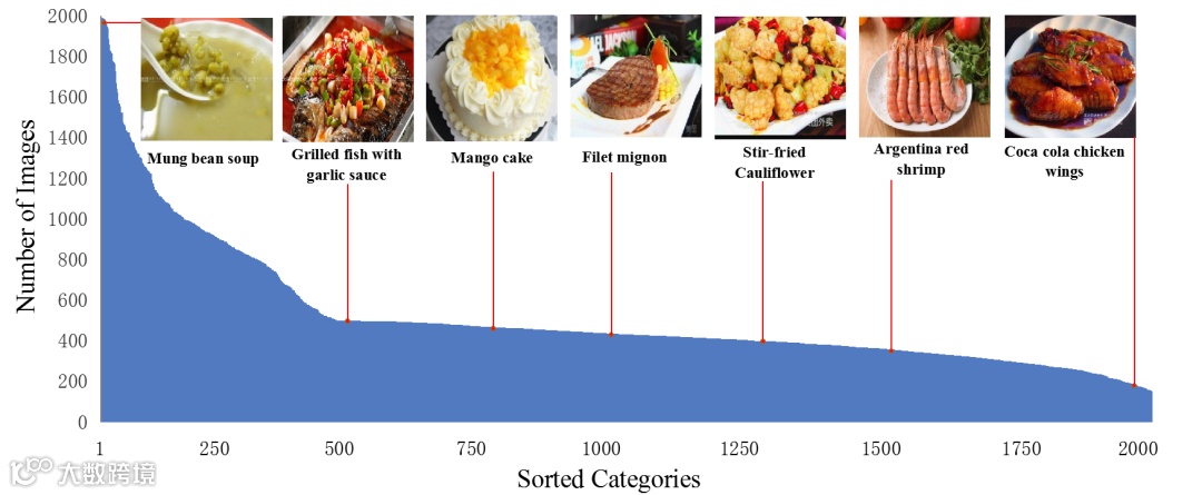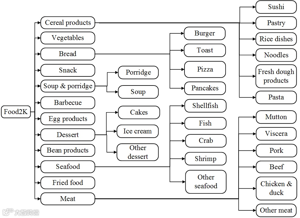 现有的工作主要是利用中小规模的图像数据集进行食品图像识别,如ETH Food-101[5]、Vireo Food-172[6]和ISIA Food- 500[7]。由于食品类别和图像数量的不足,不足以支撑更复杂更先进的食品计算统计模型的建立。考虑到大规模数据集已成为许多常规图像分类和理解任务发展的关键推动因素,因此食品计算领域也迫切需要一个大规模的食品图像数据集来开发先进的食品视觉表示学习算法,从而进一步支撑各种食品计算任务,如跨模态食谱检索和生成[8,9]。为此,我们构建了一个新的大规模基准数据集Food2K。该数据集包含1,036,564张食品图像和2,000类食品,涉及12个超类(如蔬菜、肉类、烧烤和油炸食品等)和26个子类别。与现有的数据集(如ETH Food-101)相比,Food2K在类别和图像数量均超过其一个数量级。除了规模之外,我们还进行了严格的数据清理、迭代标注和多项专业检查,以保证其数据的质量。