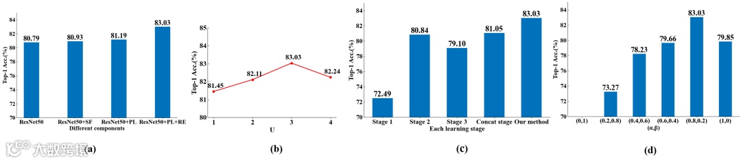 (2)渐进式学习阶段的数量U 从图5(b)中可以看出,当U从1到3时,我们的方法在Food2K上分别取得了81.45%,82.11%和83.03%的Top-1分类准确率。模型的分类性能连续提高了0.66%和0.92%。然而,当U = 4时,精度开始下降。可能的原因是浅层网络主要关注类别无关的特征。