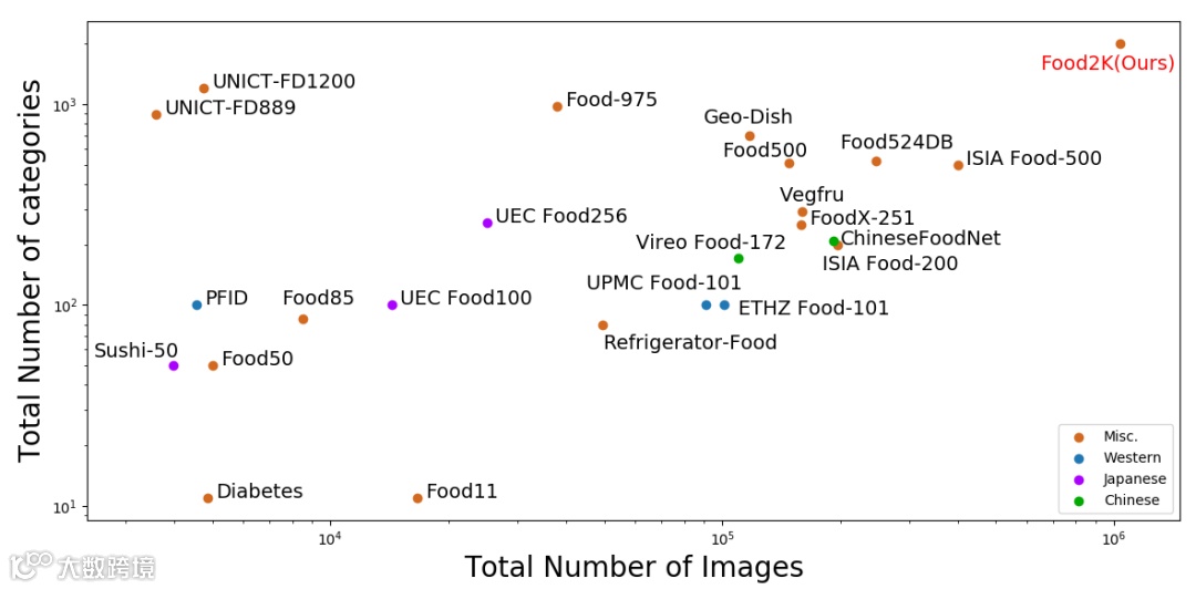 Food2K同时包含西方菜和东方菜,在食品专家的帮助下,我们结合现有的食品分类方法建立了一个食品拓扑体系。Food2K包括12个超类(如“面包”和“肉”),每个超类都有一些子类别(如“肉”中的“牛肉”和“猪肉”),每种食品类别包含许多菜肴(如“牛肉”中的“咖喱牛肉”和“小牛排”),如图1所示。图2展示了每个食品类别的图像数量。图3展示了Food2K与现有食品图像识别数据集的图像数量对比,可以看到Food2K在类别和图像数量上都远超过它们。除此之外,Food2K还具有以下特征:1)Food2K涵盖了更多样化的视觉外观和模式。不同食材组合、不同配饰、不同排列等都会导致同一类别的视觉差异。举例来说,新鲜水果沙拉因其不同的水果成分混合而呈现出不同的视觉外观。这些食品的独特特征导致了更高的类内差异,使大规模的食品图像识别变得困难。2)Food2K包含更细粒度的类别标注。以“Pizza”为例,一些经典的食品数据集,如Food-101,只有较粗粒度的披萨类。而Food2K中的披萨类则进一步分为更多的类别。不同披萨图像之间的细微视觉差异主要是由独特的食材或同一食材的粒度不同引起的,这也导致了识别的困难。所有这些因素使Food2K成为一个新的更具挑战性的大规模食品图像识别基准。
