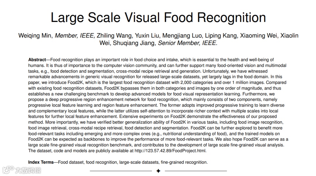 本期分享我们和美团合作发表于IEEE TPAMI2023的研究工作“Large Scale Visual Food Recognition” (Weiqing Min, Zhiling Wang, Yuxin Liu, Mengjiang Luo, Liping Kang, Xiaoming Wei, Xiaolin Wei, Shuqiang Jiang*) 。IEEE TPAMI全称为IEEE Transactions on Pattern Analysis and Machine Intelligence, 是模式识别、计算机视觉及机器学习领域的国际主流期刊,2022年公布的影响因子为24.314。
