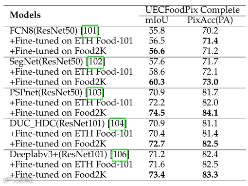 我们还评估了Food2K在食品分割任务上的性能。从表4中可以看出,对于所有使用Food2K进行预训练的模型均能带来性能的提升。这证明了我们的数据集在分割任务上良好的泛化表现。