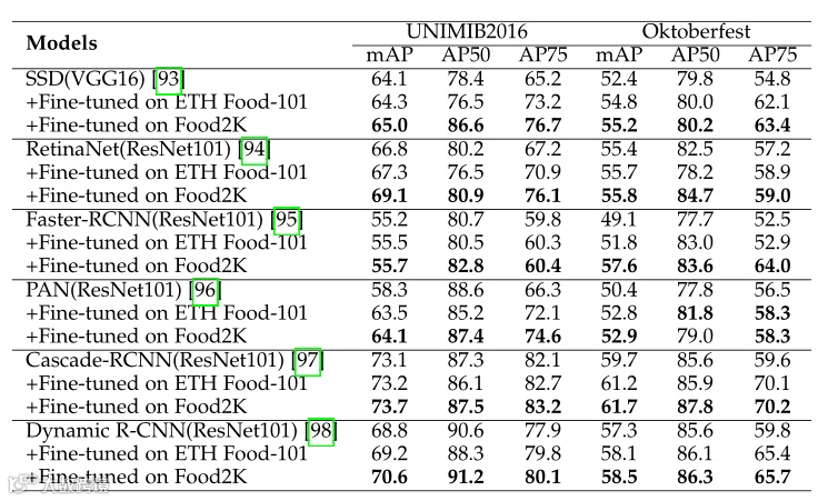 我们评估了Food2K数据集对食品检测任务的泛化能力,评估任务为检测食品托盘中的食品。为了进行比较,我们还对在ETH Food-101上进行预训练的模型进行了评估。从表3中可以看出,使用Food-101和Food2K能够提升所有方法的mAP和AP75指标,且Food2K所带来的性能增益要超过Food-101。这说明我们的方法在食品检测任务上表现出良好的泛化性能。