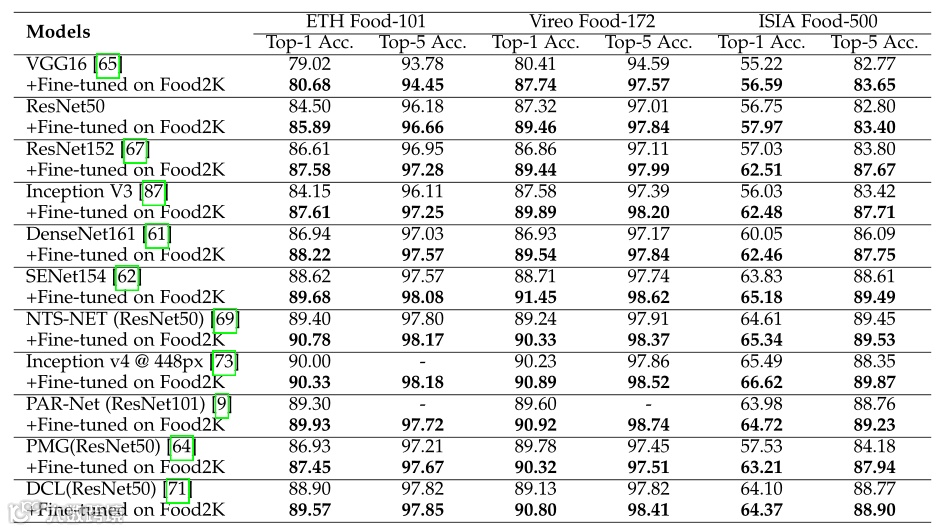 我们评估了在Food2K上预训练过的模型在ETH Food-101,Vireo Food-172和ISIA Food-500上的泛化能力。从表2中我们可以看出,使用Food2K进行预训练后所有方法都取得了一定程度的性能提升,这说明我们的数据集在食品图像识别任务上具有良好的泛化能力。