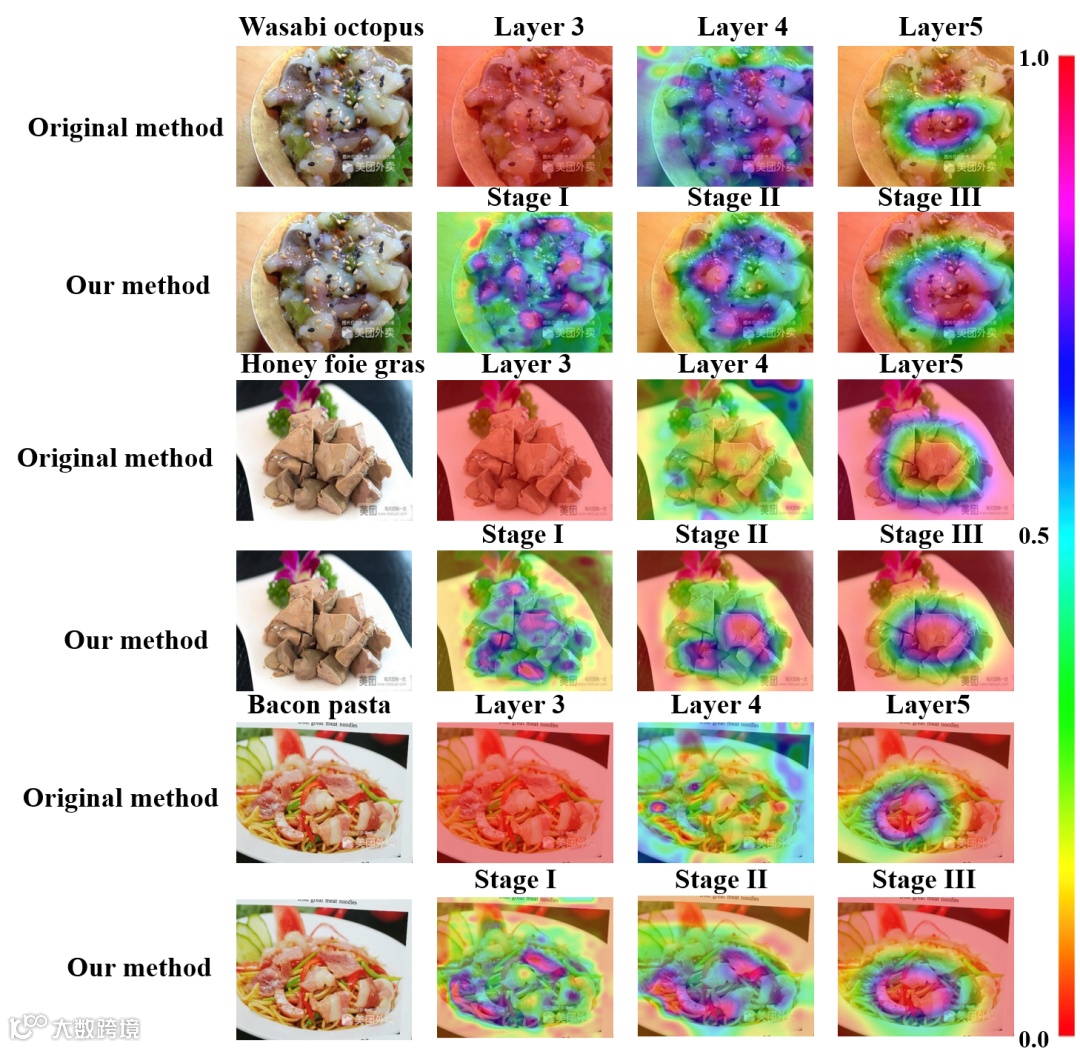 我们使用Grad-CAM来进行可视化分析。以“Wasabi Octopus”为例,基线方法仅能获得有限的信息,不同的特征图倾向于关注相似的区域。相比之下,我们的方法在第一阶段更关注“Vegetable Leaf”,而第二阶段主要关注“Octopus”。而在第三阶段,我们的方法可以捕获该食品的总体特征,因此全局和局部特征都被用于识别。