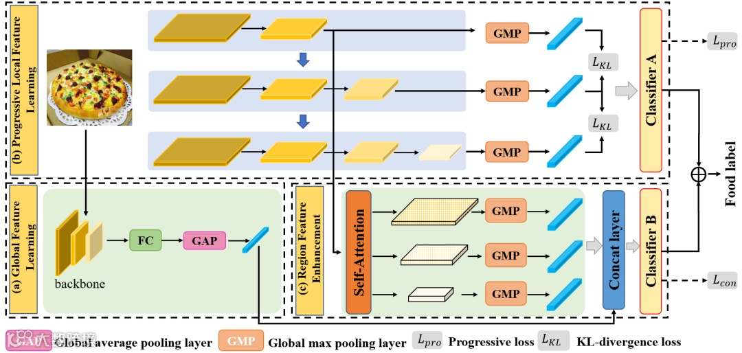 该模块旨在学习食品的判别性细粒度特征。由于不同的食材和烹饪方式,食品图像的判别性区域是多尺度和不规则的。因此我们采用了一种渐进式的学习思路。在这种策略中,我们首先训练具有较小感受野的浅层网络,然后逐渐训练更深的网络层,以扩大局部区域周围的感受野。因此,该策略首先在浅层学习更稳定的细粒度信息,然后随着训练的进行逐渐将注意力转移到更深层的粗粒度信息学习上。具体地,我们首先使用全局最大池化(Global Maximum Pooling, GMP)来获得多尺度的局部特征表示 :