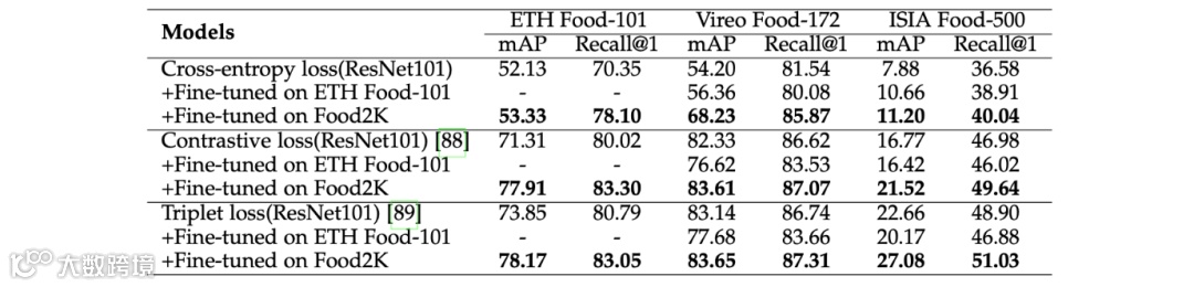 我们进一步在食品图像检索任务上验证Food-2K的泛化能力。具体来说,我们在ETH Food-101、Vireo Food-172和ISIA Food-500数据集上实验,并使用与前文相同的数据集划分方式。测试集的每张图片依次作为查询项,其余的图片作为检索库。我们分别使用交叉熵损失函数和以Contrastive loss和Triplet loss为代表的度量学习损失函数来微调ResNet101网络,并使用mAP和Recall@1指标评估方法的性能。