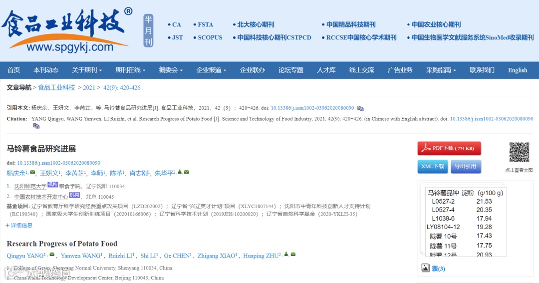 中国是马铃薯种植和生产的大国,联合国粮食及农业组织(FAO)数据显示2019年我国马铃薯种植面积达到478.95万公顷,单位面积产量达到19139.7千克/公顷,总产量为9193.8万吨,占全球总产量的24.91%。但是,与国外以薯泥、炸薯条作为主食的饮食习惯不同,马铃薯在大部分国人眼中仍属于鲜食蔬菜类作物,导致我国马铃薯主粮化进程较慢。虽然十三五以来国内相关学者研究了上百种马铃薯产品,但由于马铃薯主粮产业化战略时间较短,马铃薯主食产品的发展尚未成熟,生产规模小,市场覆盖率不高,消费者对马铃薯主食产品消费认知、购买行为的意识还需进一步提升。据统计,我国消费者对马铃薯主粮化战略的知晓率较高,但对马铃薯主食的营养及其健康功效认知参差不齐,甚至存有误解,七成以上受访者有购买过马铃薯主食的经历,但并没有将其作为一日三餐主要的主食选择。因此,推进马铃薯主粮化发展的根本是需转变我国居民的饮食观念,让消费者正确认知马铃薯营养成分、功能特性、主食食品膳食结构等相关概念,让马铃薯食品融入消费者生活,提高其市场覆盖率,从而推动马铃薯食品产业稳步发展,将马铃薯打造成为种植范围广、加工用途多样、产品种类丰富的餐桌主食。因此,朱华平团队通过对马铃薯营养成分、功能特性和马铃薯食品研究进行综述,以期为马铃薯的综合利用提供有益思考。