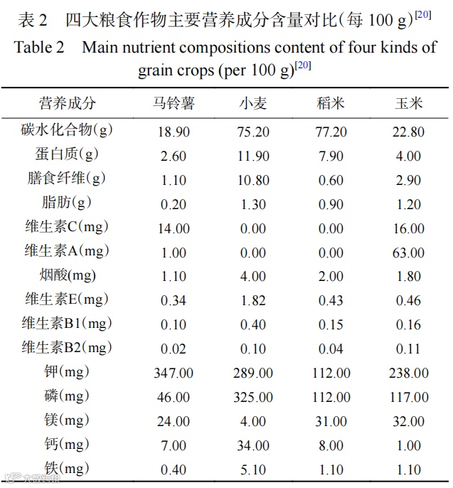 马铃薯因其营养全面,被称为“十全十美”的食物。马铃薯块茎中蛋白质属于完全蛋白质,富含人体所需的18种氨基酸,其中必需氨基酸含量占氨基酸总量的47.9%,氨基酸组成接近于FAO/WHO模式。侯飞娜等采用国际通用的WHO/FAO氨基酸评分模式对我国22个马铃薯品种营养品质进行评价。结果表明,22种马铃薯中平均必须氨基酸含量占总氨基酸含量的41.92%,高于WHO/FAO所推荐的理想蛋白必需氨基酸占总氨基酸含量的36%,接近标准鸡蛋蛋白。刘素稳等通过大鼠实验将马铃薯蛋白与酪蛋白进行对比,实验结果显示马铃薯蛋白可明显促进动物的生长发育,其营养价值不亚于酪蛋白,是一种天然的优良蛋白质。马铃薯作为维生素含量最全面的粮食作物,富含多种维生素,包括维生素A、维生素B1、维生素B2、维生素C、维生素pp、维生素E、维生素M等。研究表明,250 g新鲜马铃薯可提供一个人一昼夜消耗所需要的维生素量。马铃薯中还含有多种矿物质,如钾、镁、钠、磷等元素,其与小麦、稻米、玉米营养成分对比如表2所示。马铃薯营养成分均衡,与小麦、稻米、玉米相比具有明显优势。