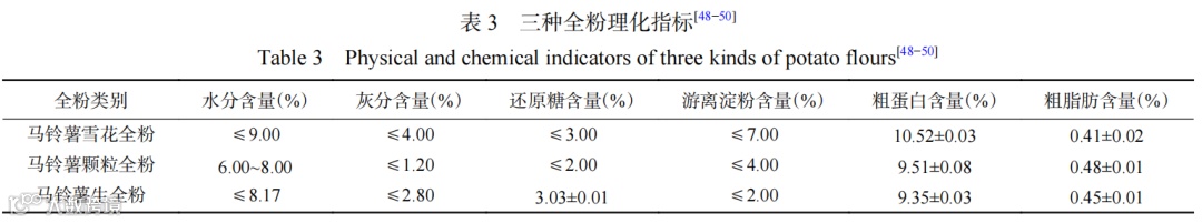 马铃薯全粉是一种优质的食品加工原辅料,可直接制作成薯饼、薯条、薯泥等休闲食品,也可与小麦粉复配用于生产马铃薯面包、马铃薯馒头、马铃薯面条等主食产品。目前市面上应用最为广泛的马铃薯全粉主要包括马铃薯颗粒全粉和马铃薯雪花粉以及马铃薯生全粉,三种全粉的理化指标如表3所示。