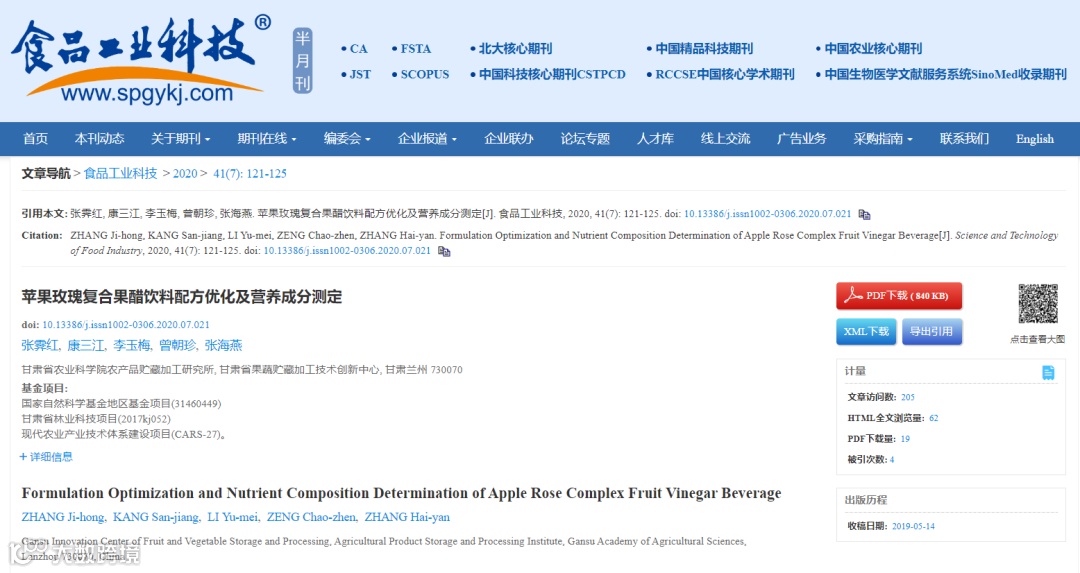 目前,国内对于多种果蔬制成的复合型功能性饮料已经有很多的研究和报道,但苹果醋饮料的研究主要集中在单一水果原料的开发,工艺、配方优化,营养物质分析以及检测方法研究等方面。在苹果醋饮料中添加具有美容、养颜功效的药食两用植物玫瑰提取液,制取苹果玫瑰复合保健饮料的研究及开发果醋复合饮料方面研究报道较少。张霁红团队以饮料用苹果醋、玫瑰水提物、苹果浓缩汁为主料,优化配方,生产苹果玫瑰醋复合饮料,并对产品进行理化指标、微生物指标和营养物质的测定,探索玫瑰天然色素、香精、营养物质与苹果醋饮料的互补优化,以期为复合苹果醋饮料的开发研制提供参考。