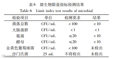产品微生物限量检测委托甘肃中商食品质量检验检测有限公司进行,检测结果如表6所示,该中试产品苹果玫瑰醋复合饮料中微生物限量指标符合食品卫生要求。